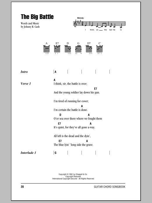 Download or print Johnny Cash The Big Battle sheet music, chords and digital score arranged for Piano, Vocal & Guitar Chords (Right-Hand Melody). This Country score includes 4 page(s).