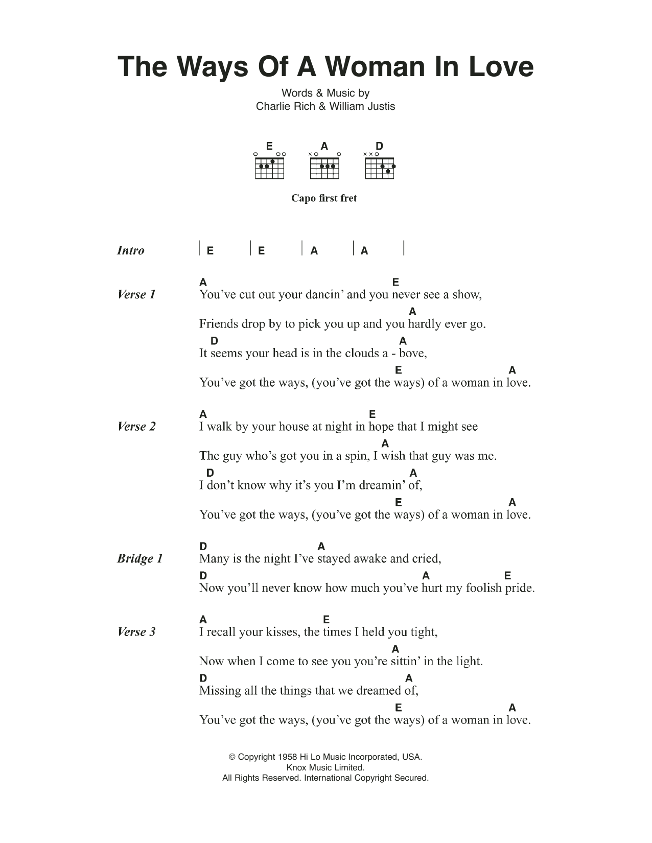 Download or print Johnny Cash The Ways Of A Woman In Love sheet music, chords and digital score arranged for Guitar Chords/Lyrics. This Country score includes 2 page(s).