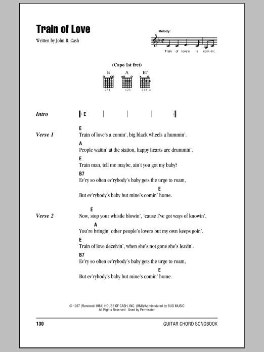 Download or print Johnny Cash Train Of Love sheet music, chords and digital score arranged for Piano, Vocal & Guitar Chords (Right-Hand Melody). This Country score includes 2 page(s).