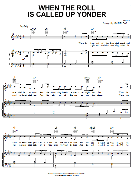 Download or print Johnny Cash When The Roll Is Called Up Yonder sheet music, chords and digital score arranged for Piano, Vocal & Guitar Chords (Right-Hand Melody). This Christian score includes 3 page(s).