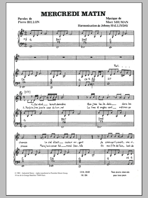 Download or print Johnny Hallyday Mercredi Matin sheet music, chords and digital score arranged for Piano & Vocal. This Pop score includes 4 page(s).