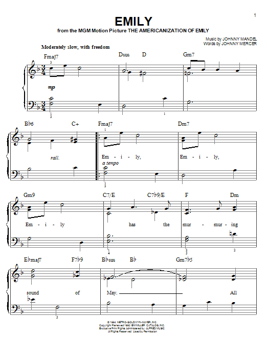 Download or print Johnny Mandel Emily sheet music, chords and digital score arranged for Piano, Vocal & Guitar Chords (Right-Hand Melody). This Jazz score includes 4 page(s).