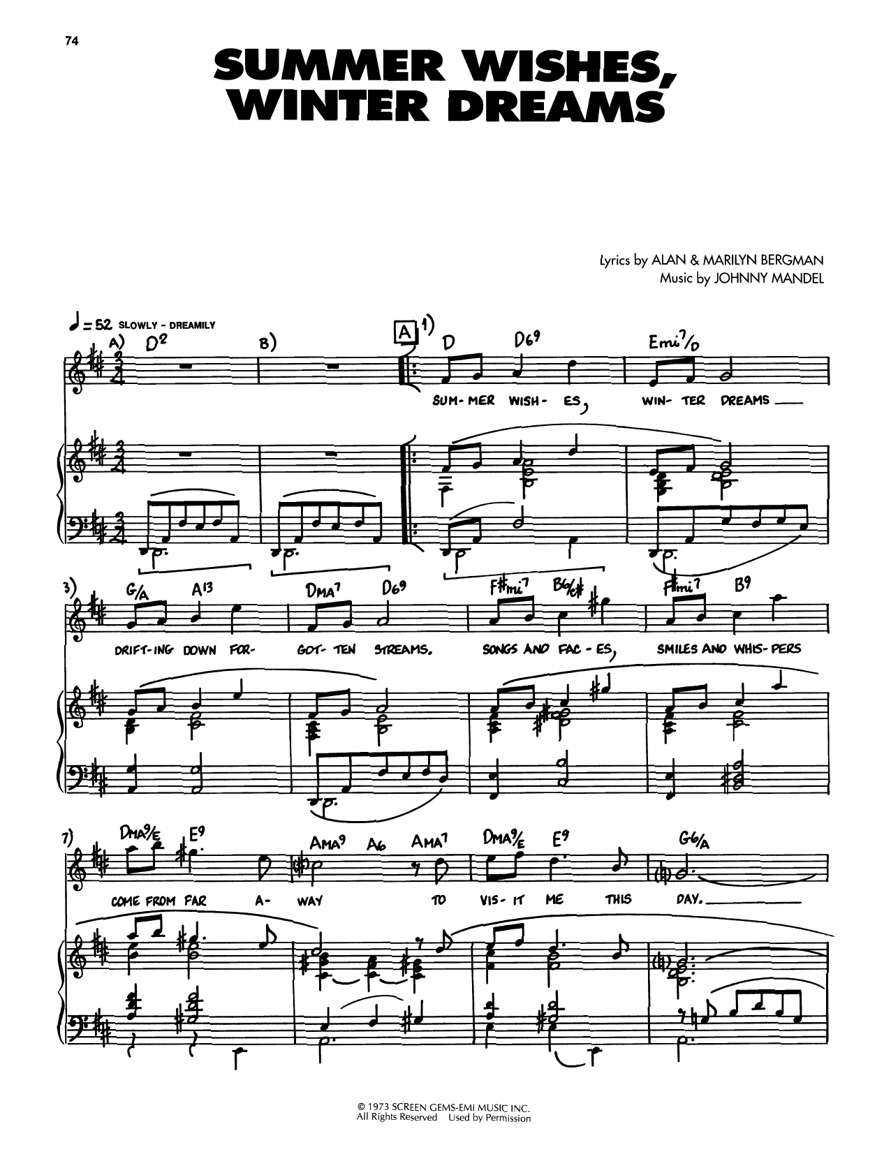 Download or print Johnny Mandel Summer Wishes, Winter Dreams sheet music, chords and digital score arranged for Piano, Vocal & Guitar Chords (Right-Hand Melody). This Rock score includes 2 page(s).