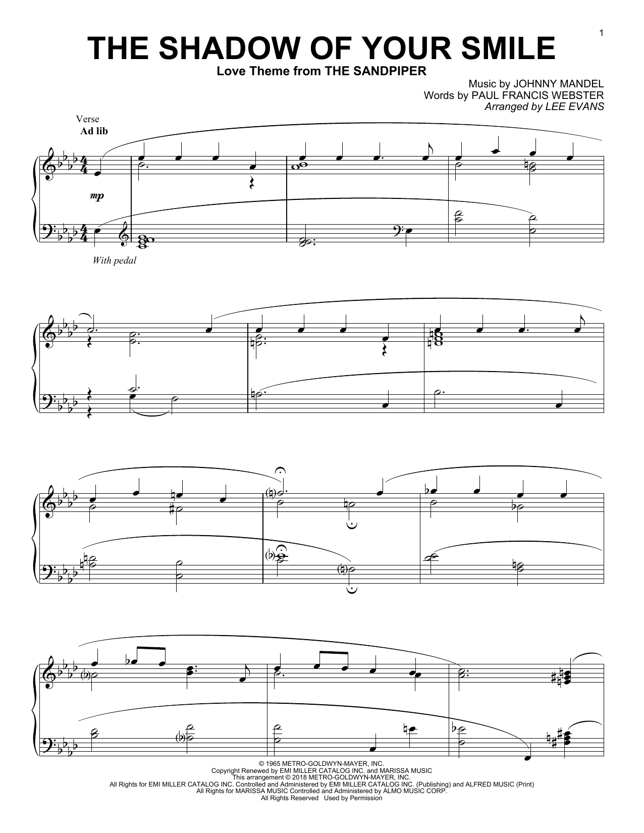 Download or print Johnny Mandel The Shadow Of Your Smile (arr. Lee Evans) sheet music, chords and digital score arranged for Piano Solo. This Jazz score includes 5 page(s).