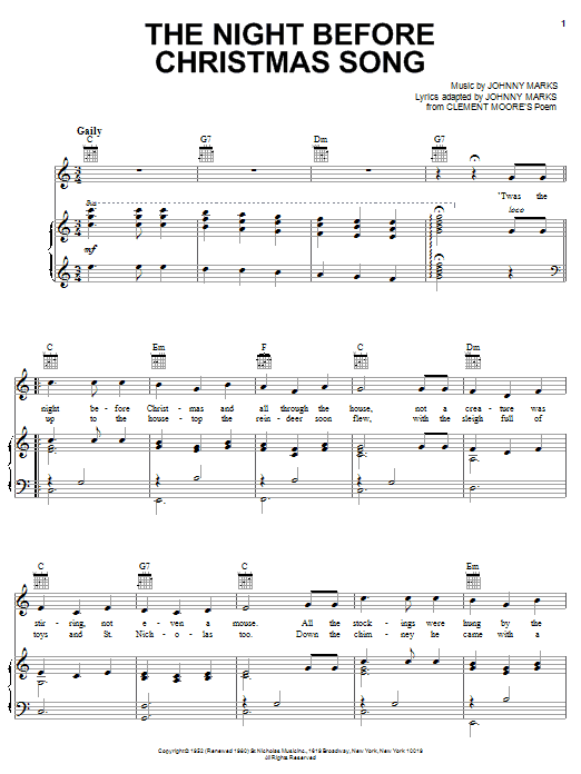 Download or print Johnny Marks The Night Before Christmas Song sheet music, chords and digital score arranged for Easy Piano. This Children score includes 3 page(s).