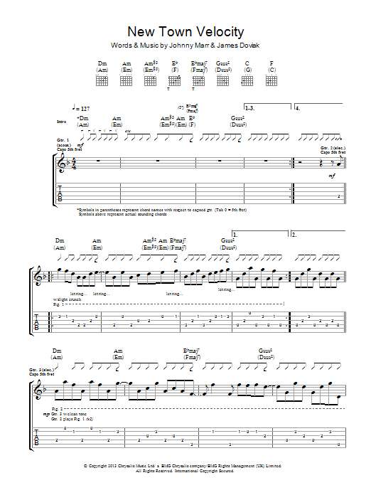 Download or print Johnny Marr New Town Velocity sheet music, chords and digital score arranged for Guitar Tab. This Rock score includes 10 page(s).