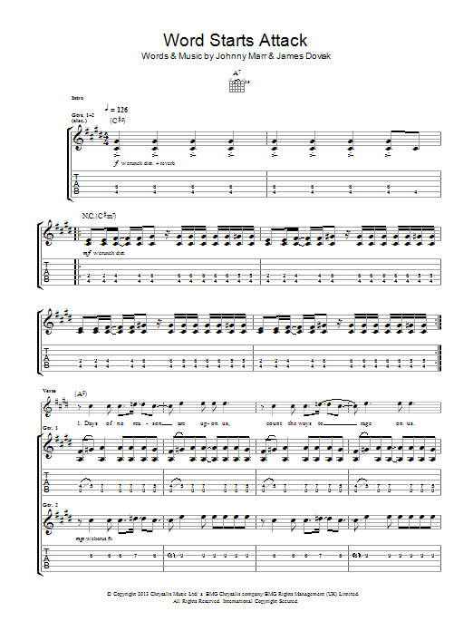 Download or print Johnny Marr Word Starts Attack sheet music, chords and digital score arranged for Guitar Tab. This Rock score includes 11 page(s).