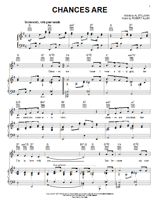Download or print Johnny Mathis Chances Are sheet music, chords and digital score arranged for Lead Sheet / Fake Book. This Pop score includes 1 page(s).