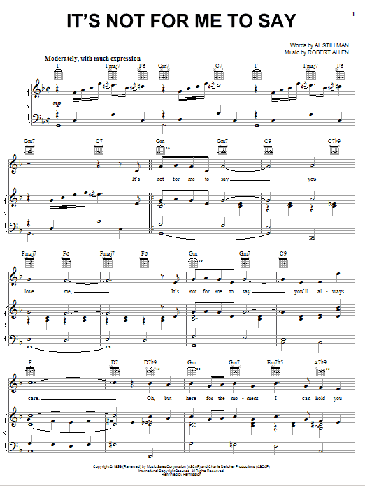 Download or print Johnny Mathis It's Not For Me To Say sheet music, chords and digital score arranged for Lead Sheet / Fake Book. This Pop score includes 1 page(s).