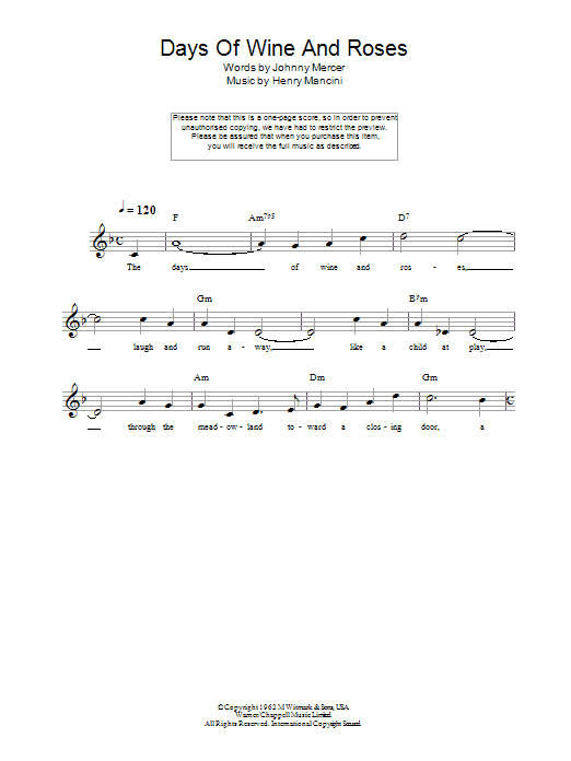 Download or print Johnny Mercer Days Of Wine And Roses sheet music, chords and digital score arranged for Lead Sheet / Fake Book. This Standards score includes 2 page(s).
