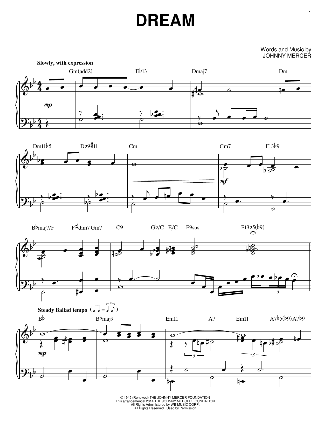 Download or print Johnny Mercer Dream [Jazz version] (arr. Brent Edstrom) sheet music, chords and digital score arranged for Piano Solo. This Jazz score includes 3 page(s).
