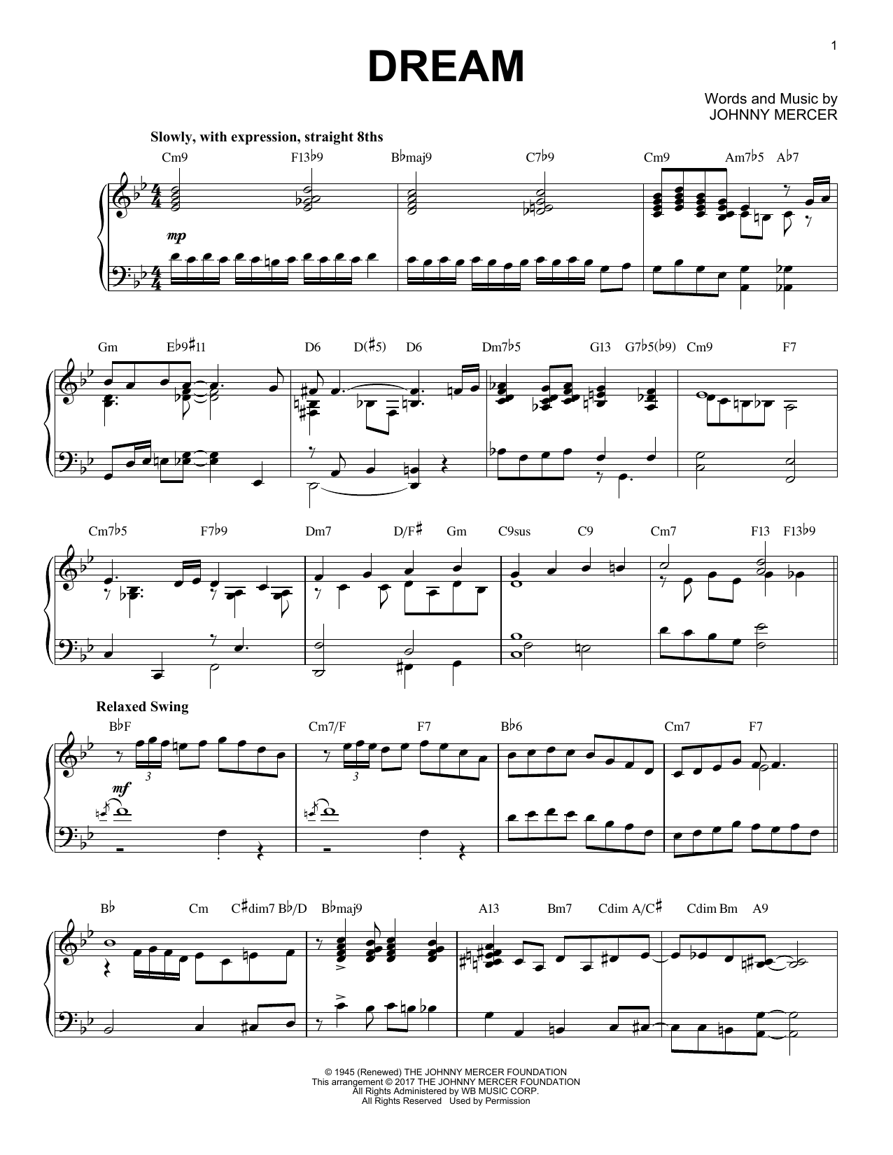 Download or print Johnny Mercer Dream [Jazz version] sheet music, chords and digital score arranged for Piano Solo. This Standards score includes 4 page(s).