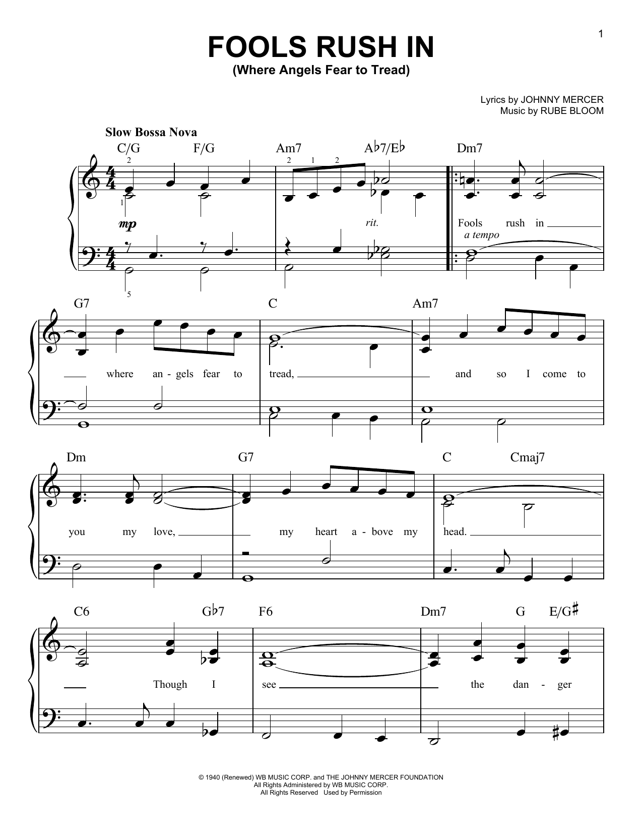 Download or print Johnny Mercer Fools Rush In (Where Angels Fear To Tread) sheet music, chords and digital score arranged for Easy Piano. This Jazz score includes 3 page(s).