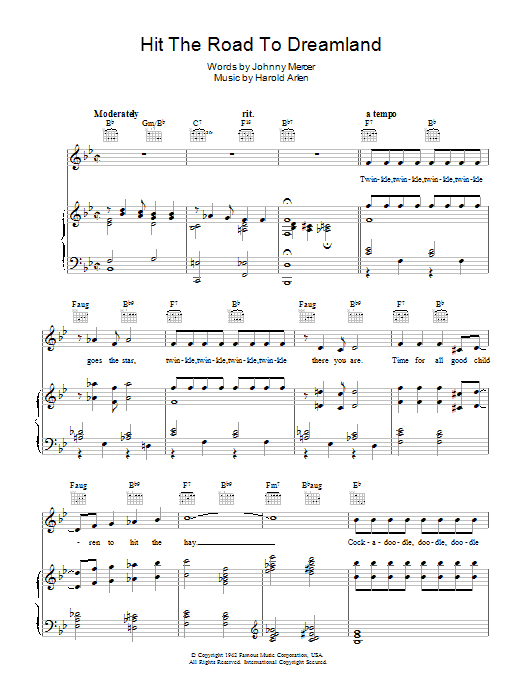 Download or print Johnny Mercer Hit The Road To Dreamland sheet music, chords and digital score arranged for Piano, Vocal & Guitar Chords (Right-Hand Melody). This Film/TV score includes 4 page(s).