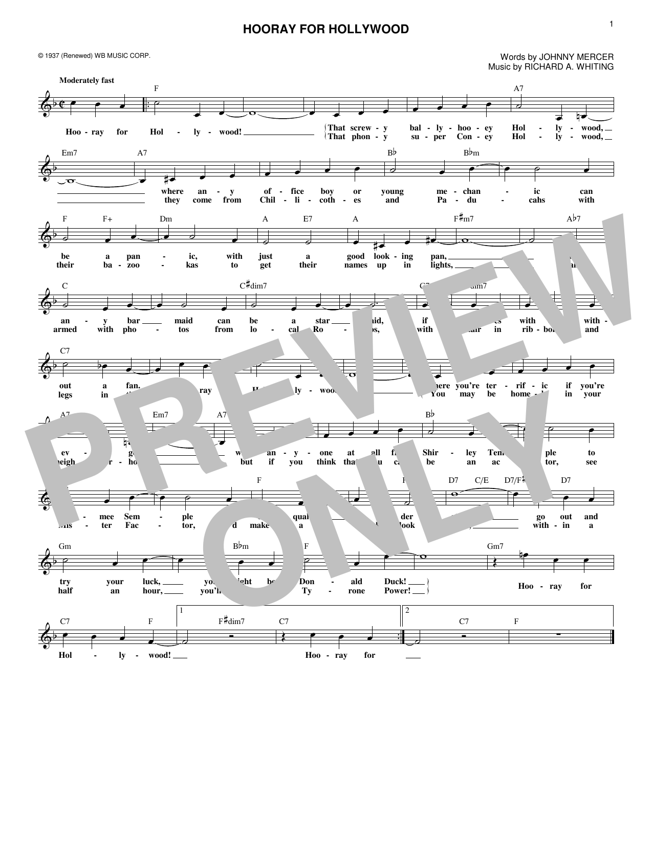 Download or print Johnny Mercer Hooray For Hollywood sheet music, chords and digital score arranged for Piano, Vocal & Guitar Chords (Right-Hand Melody). This Jazz score includes 4 page(s).