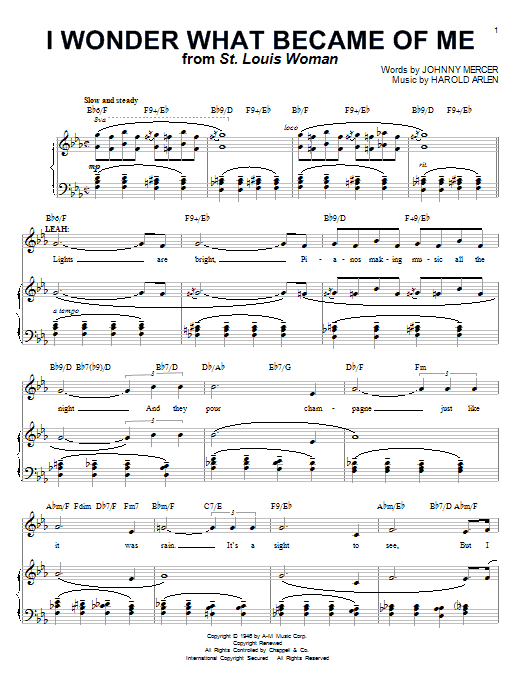 Download or print Johnny Mercer I Wonder What Became Of Me sheet music, chords and digital score arranged for Piano & Vocal. This Jazz score includes 4 page(s).
