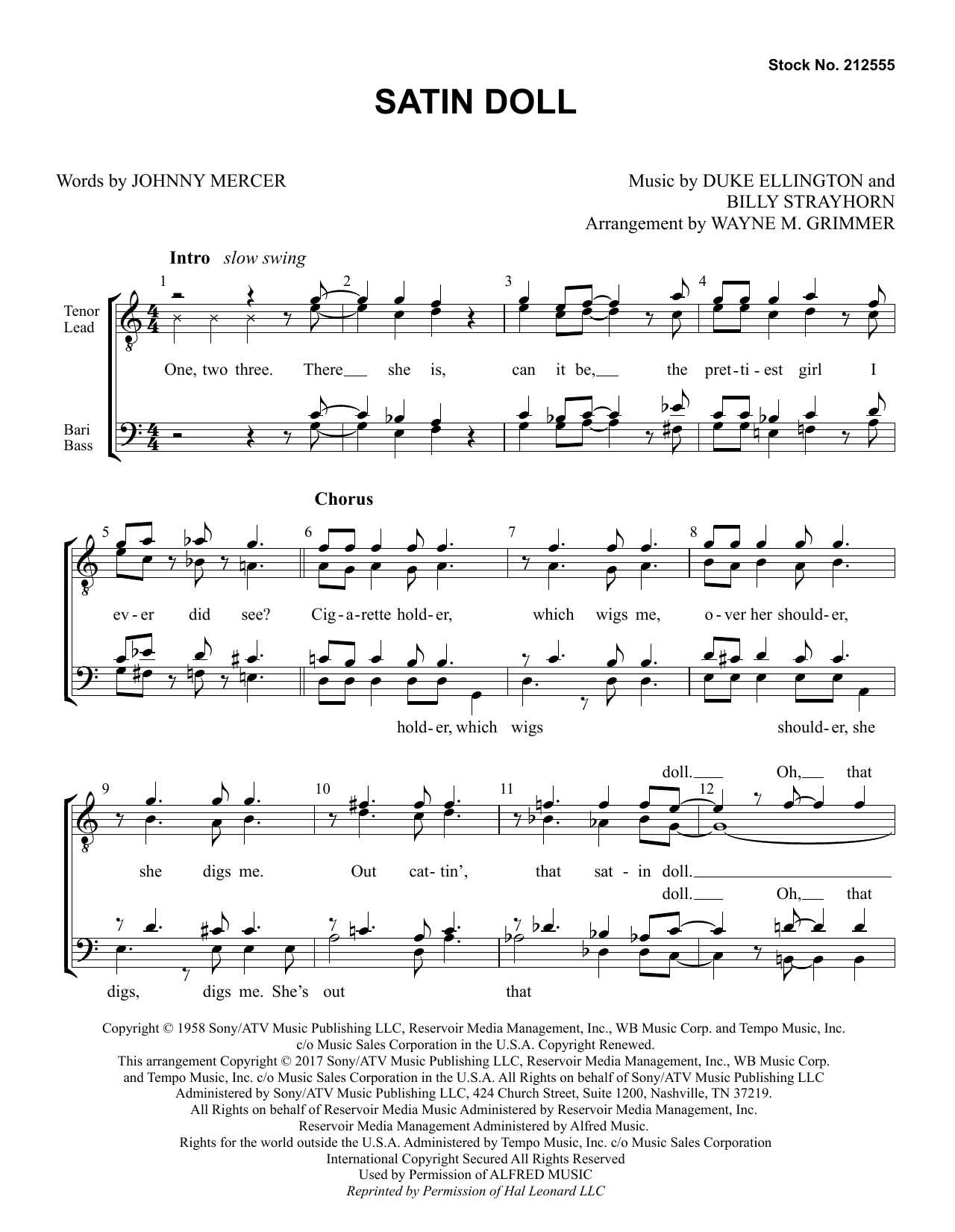Download or print Johnny Mercer Satin Doll (arr. Wayne Grimmer) sheet music, chords and digital score arranged for TTBB Choir. This Barbershop score includes 5 page(s).