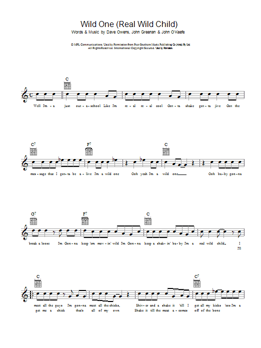Download or print Johnny O'Keefe Real Wild Child (Wild One) sheet music, chords and digital score arranged for Guitar Chords/Lyrics. This Rock score includes 3 page(s).
