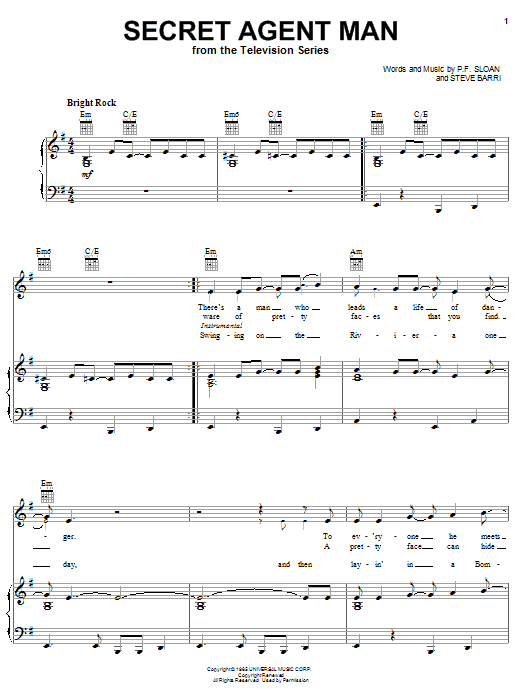 Download or print Johnny Rivers Secret Agent Man sheet music, chords and digital score arranged for Piano, Vocal & Guitar Chords (Right-Hand Melody). This Film/TV score includes 3 page(s).
