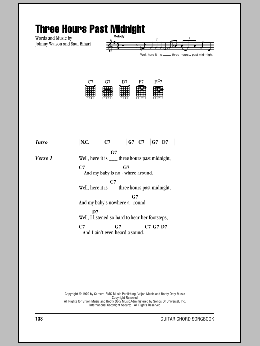 Download or print Johnny Watson Three Hours Past Midnight sheet music, chords and digital score arranged for Solo Guitar. This Pop score includes 3 page(s).