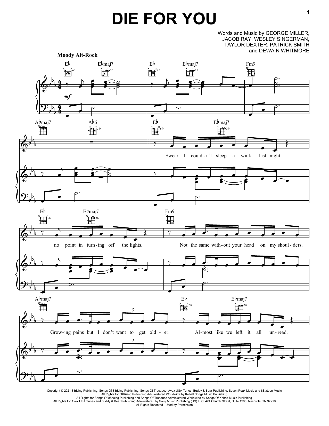 Download or print Joji Die For You sheet music, chords and digital score arranged for Piano, Vocal & Guitar Chords (Right-Hand Melody). This Pop score includes 5 page(s).