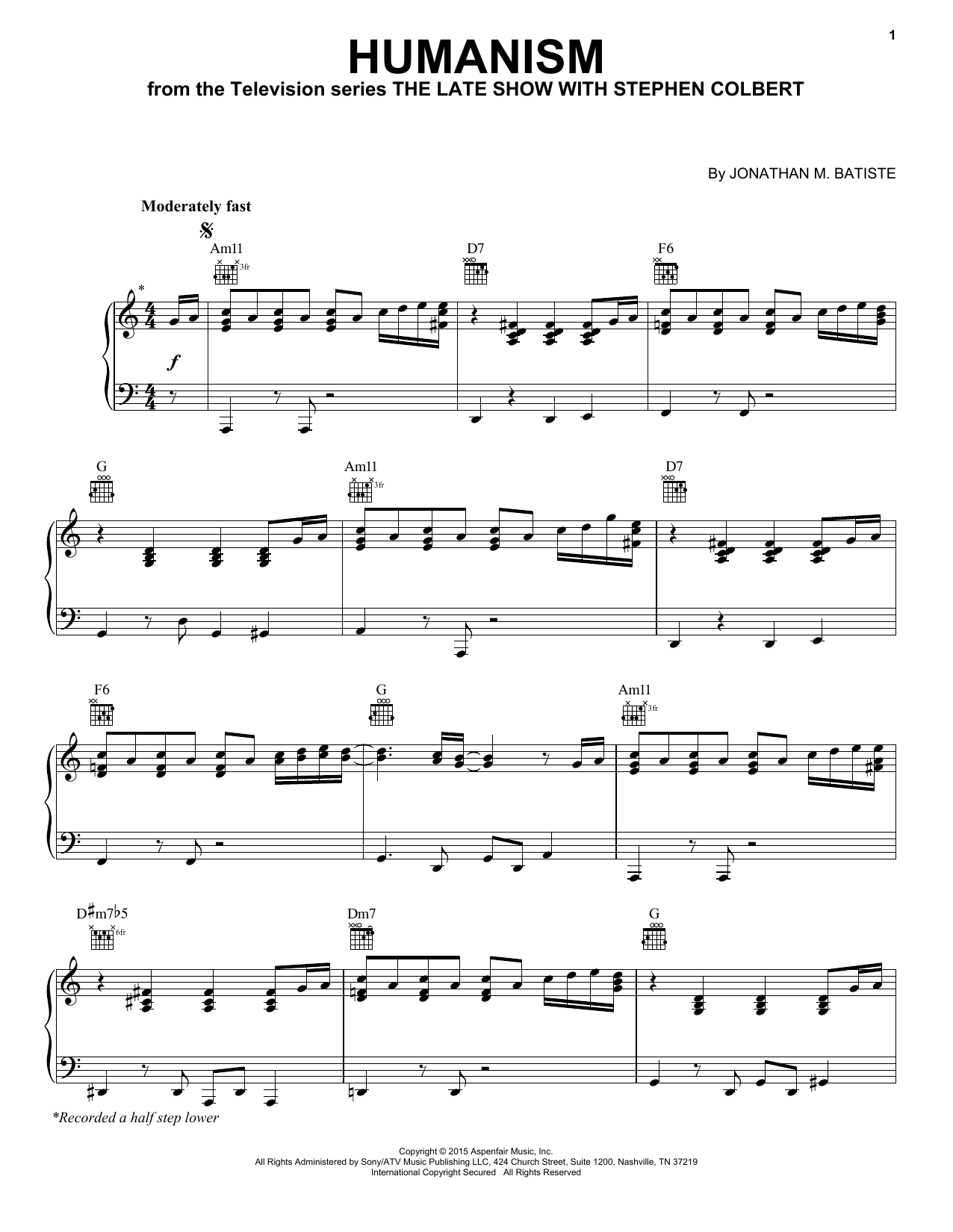 Download or print Jon Batiste Humanism (from The Late Show with Stephen Colbert) sheet music, chords and digital score arranged for Piano Solo. This Film/TV score includes 3 page(s).