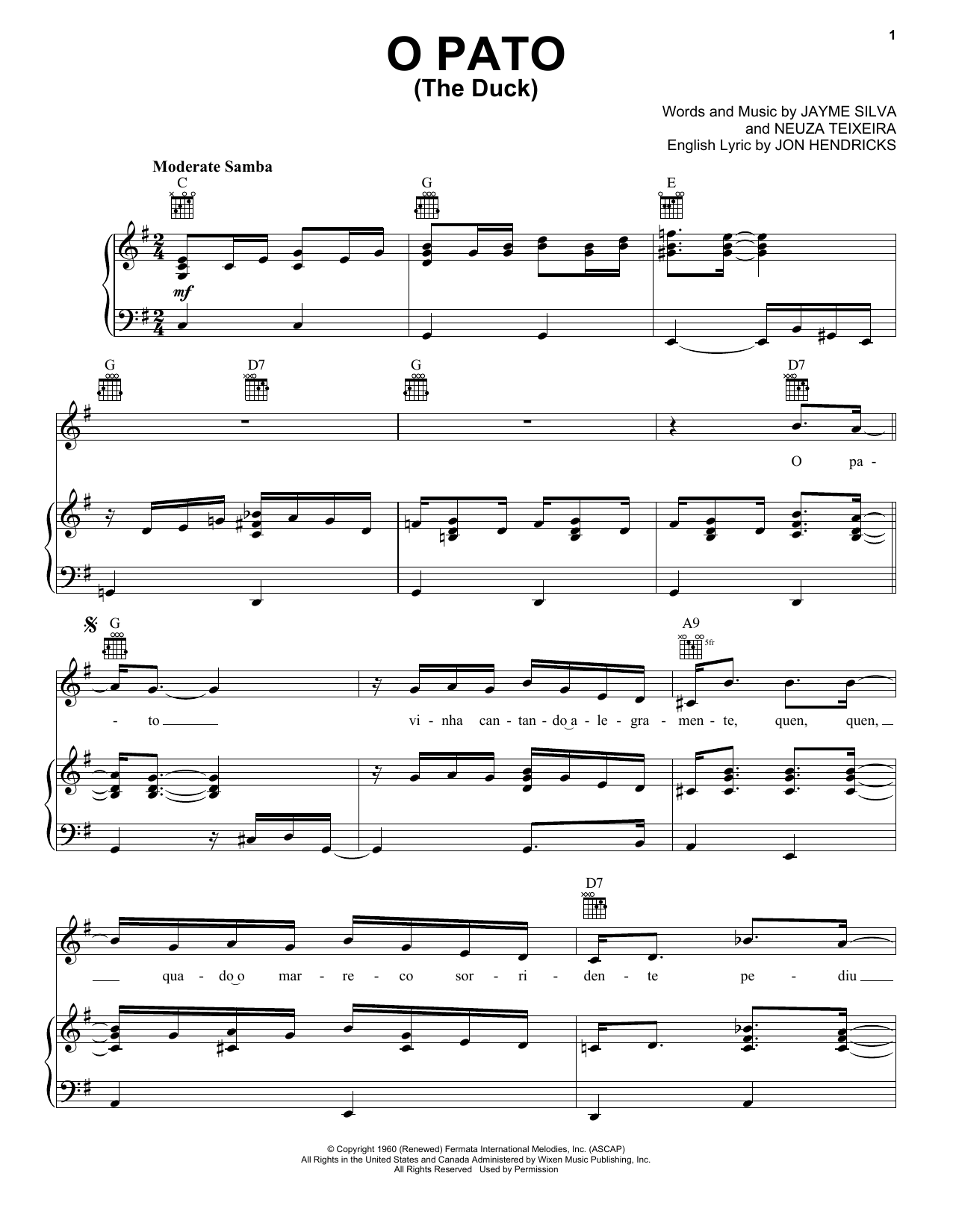 Download or print Jon Hendricks O Pato (The Duck) sheet music, chords and digital score arranged for Piano, Vocal & Guitar Chords (Right-Hand Melody). This Jazz score includes 4 page(s).