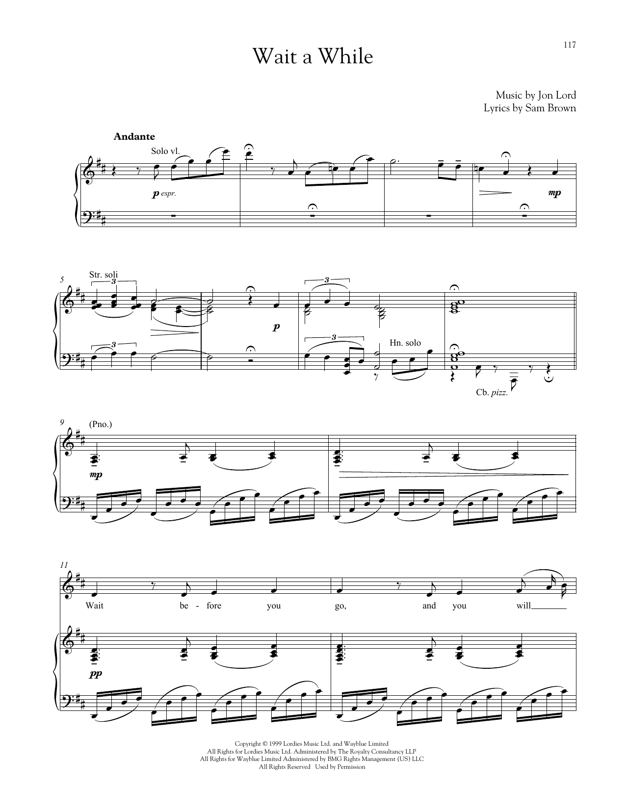 Download or print Jon Lord Wait A While sheet music, chords and digital score arranged for Piano & Vocal. This Pop score includes 11 page(s).