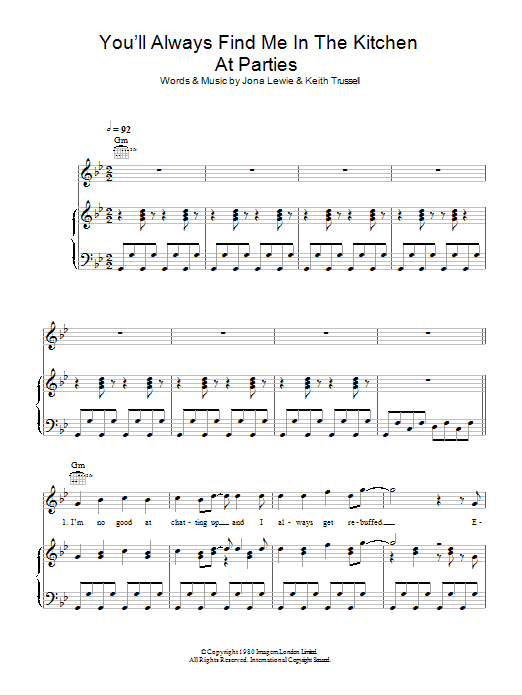Download or print Jona Lewie You'll Always Find Me In The Kitchen At Parties sheet music, chords and digital score arranged for Piano, Vocal & Guitar Chords. This Pop score includes 7 page(s).