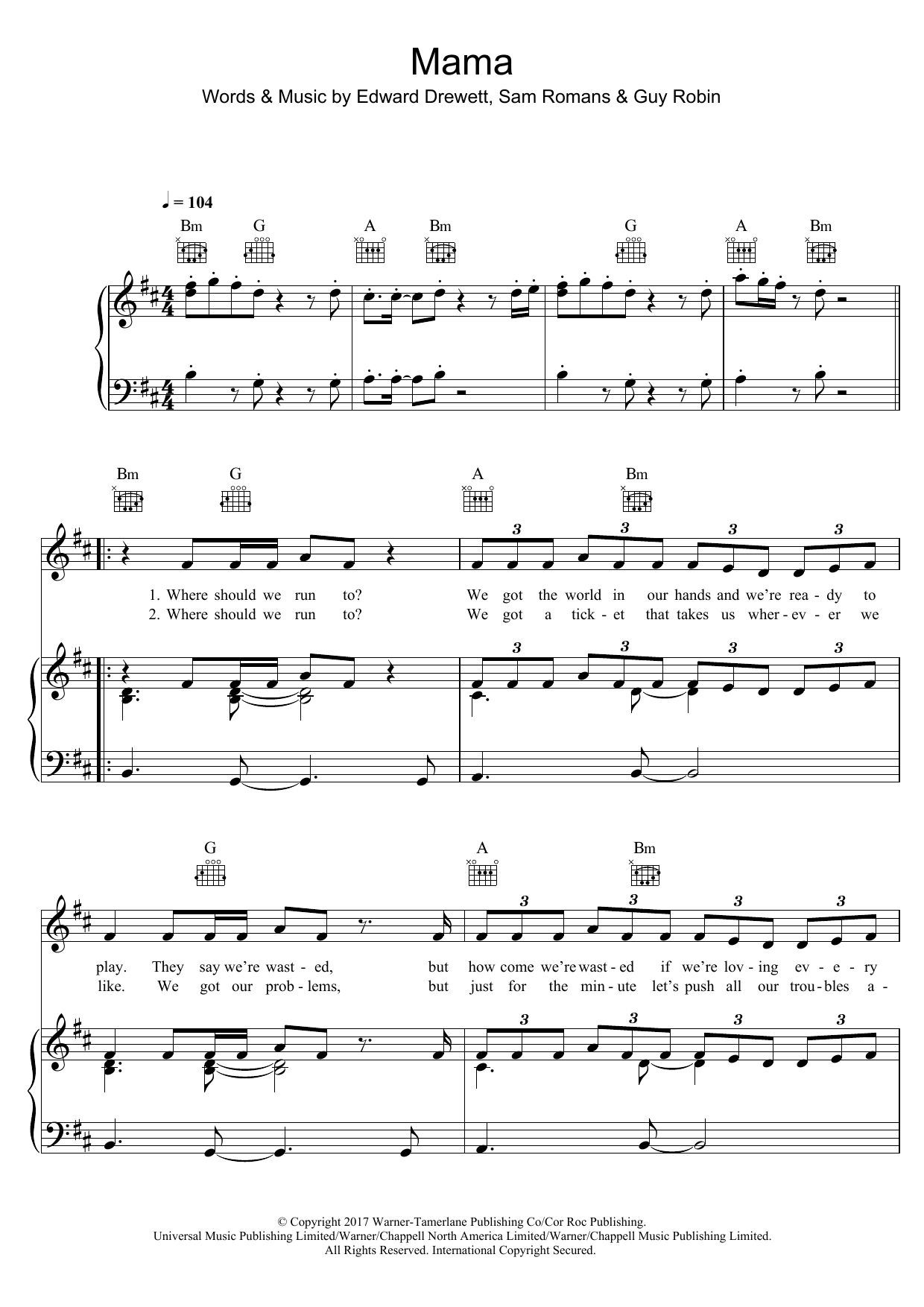 Download or print Jonas Blue Mama (featuring William Singe) sheet music, chords and digital score arranged for Piano, Vocal & Guitar Chords. This Pop score includes 7 page(s).