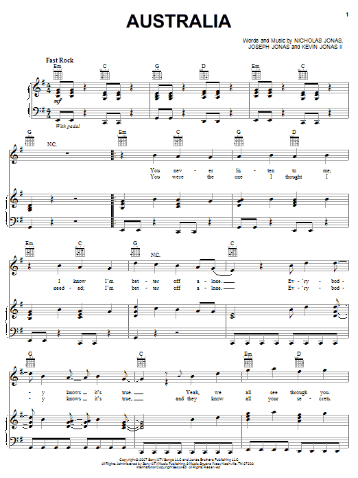 Download or print Jonas Brothers Australia sheet music, chords and digital score arranged for Piano, Vocal & Guitar Chords (Right-Hand Melody). This Pop score includes 8 page(s).