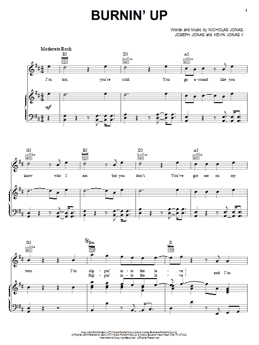 Download or print Jonas Brothers Burnin' Up sheet music, chords and digital score arranged for Easy Piano. This Pop score includes 6 page(s).
