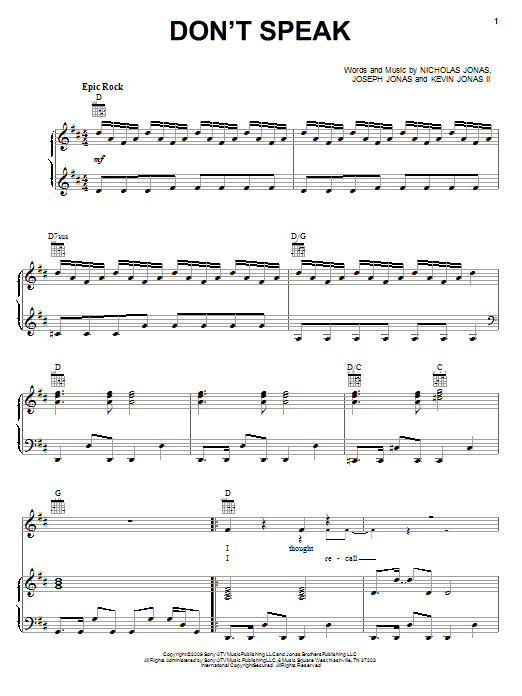 Download or print Jonas Brothers Don't Speak sheet music, chords and digital score arranged for Piano, Vocal & Guitar Chords (Right-Hand Melody). This Pop score includes 6 page(s).