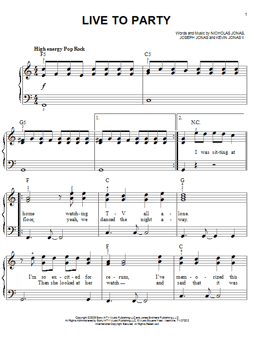 Download or print Jonas Brothers Live To Party sheet music, chords and digital score arranged for Easy Piano. This Rock score includes 6 page(s).
