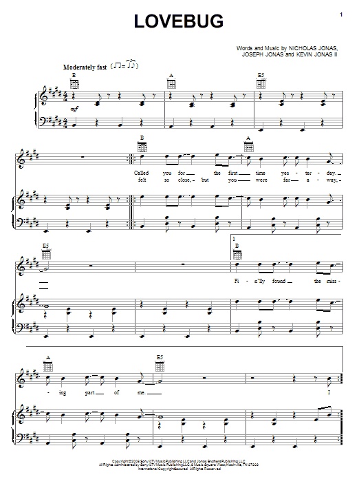 Download or print Jonas Brothers Lovebug sheet music, chords and digital score arranged for Educational Piano. This Pop score includes 4 page(s).