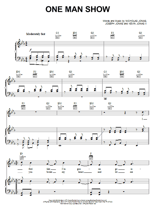 Download or print Jonas Brothers One Man Show sheet music, chords and digital score arranged for Easy Piano. This Pop score includes 7 page(s).
