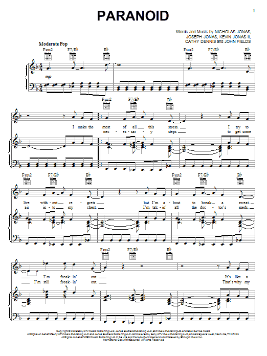Download or print Jonas Brothers Paranoid sheet music, chords and digital score arranged for Easy Piano. This Pop score includes 5 page(s).