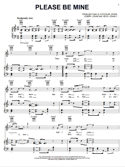 Download or print Jonas Brothers Please Be Mine sheet music, chords and digital score arranged for Piano, Vocal & Guitar Chords (Right-Hand Melody). This Pop score includes 4 page(s).