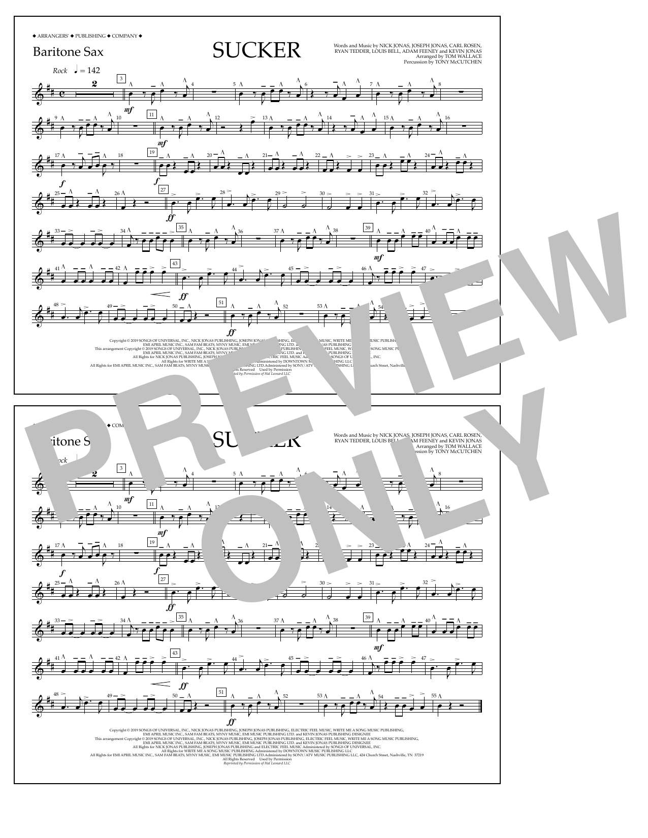 Download or print Jonas Brothers Sucker (arr. Tom Wallace) - Baritone Sax sheet music, chords and digital score arranged for Marching Band. This Pop score includes 1 page(s).