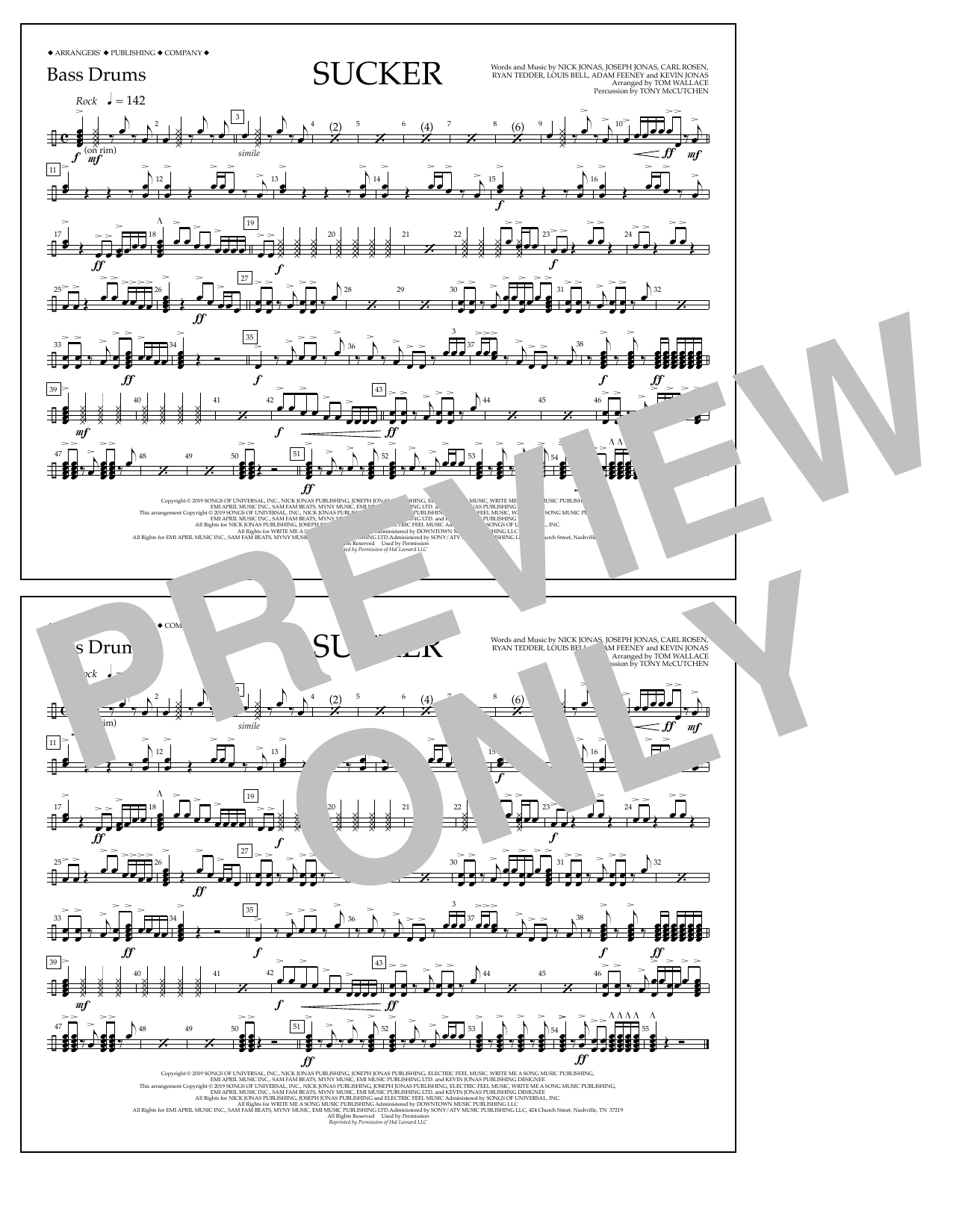 Quick facts Sucker (arr. Tom Wallace) - Bass Drums about digital sheet music
