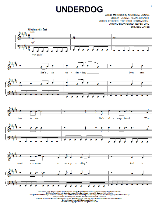 Download or print Jonas Brothers Underdog sheet music, chords and digital score arranged for Piano, Vocal & Guitar Chords (Right-Hand Melody). This Pop score includes 7 page(s).