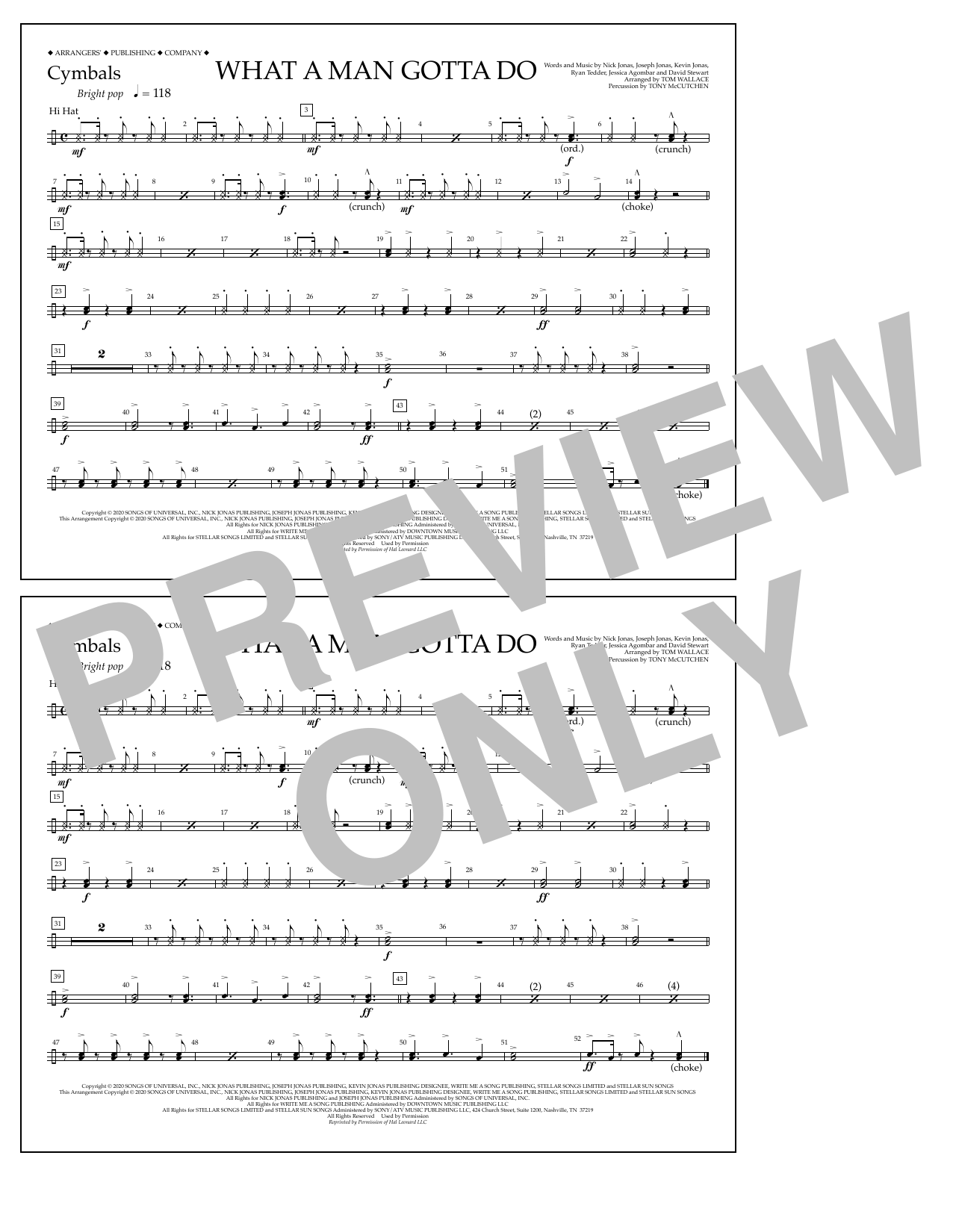 Download or print Jonas Brothers What a Man Gotta Do (arr. Tom Wallace) - Cymbals sheet music, chords and digital score arranged for Marching Band. This Pop score includes 1 page(s).