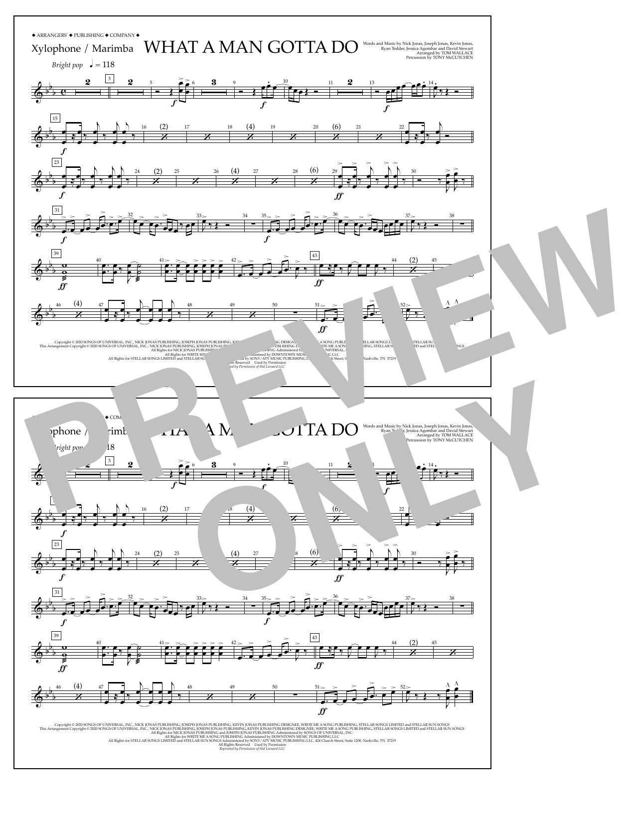 Download or print Jonas Brothers What a Man Gotta Do (arr. Tom Wallace) - Xylophone/Marimba sheet music, chords and digital score arranged for Marching Band. This Pop score includes 1 page(s).