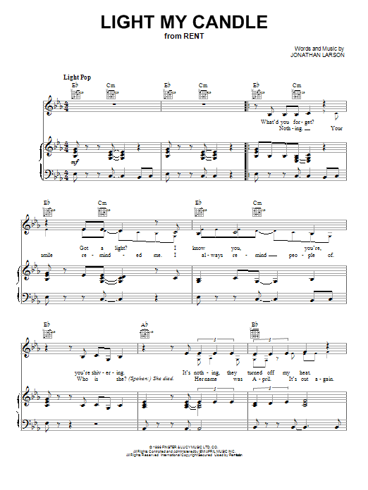 Download or print Jonathan Larson Light My Candle sheet music, chords and digital score arranged for Piano, Vocal & Guitar Chords (Right-Hand Melody). This Film/TV score includes 11 page(s).