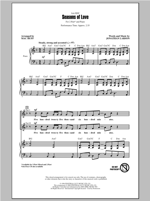 Download or print Jonathan Larson Seasons Of Love (from Rent) (arr. Mac Huff) sheet music, chords and digital score arranged for 3-Part Mixed Choir. This Musical/Show score includes 11 page(s).