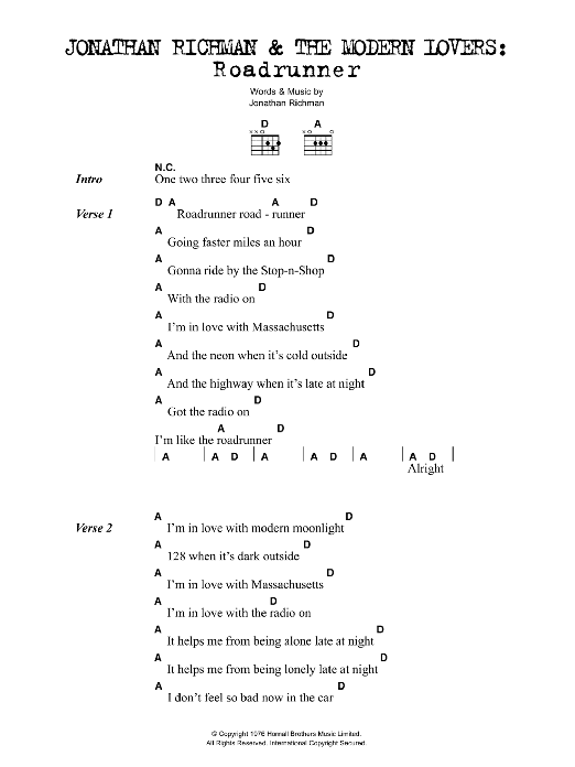 Download or print Jonathan Richman Roadrunner sheet music, chords and digital score arranged for Guitar Chords/Lyrics. This Rock score includes 3 page(s).