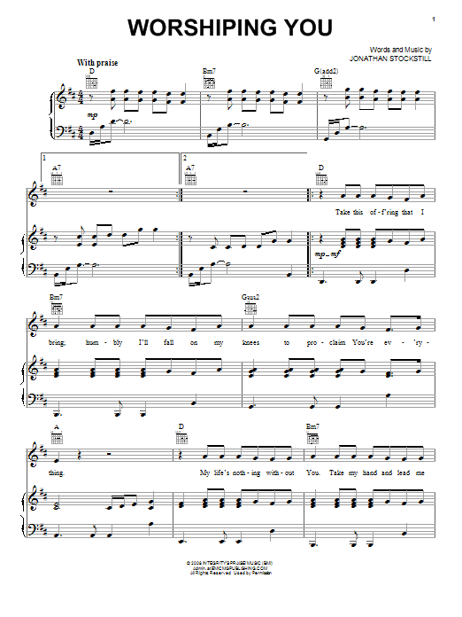 Download or print Jonathan Stockstill Worshiping You sheet music, chords and digital score arranged for Piano, Vocal & Guitar Chords (Right-Hand Melody). This Christian score includes 5 page(s).