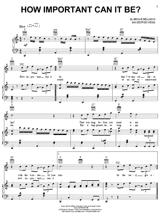 Download or print Joni James How Important Can It Be sheet music, chords and digital score arranged for Piano, Vocal & Guitar Chords (Right-Hand Melody). This Film/TV score includes 3 page(s).