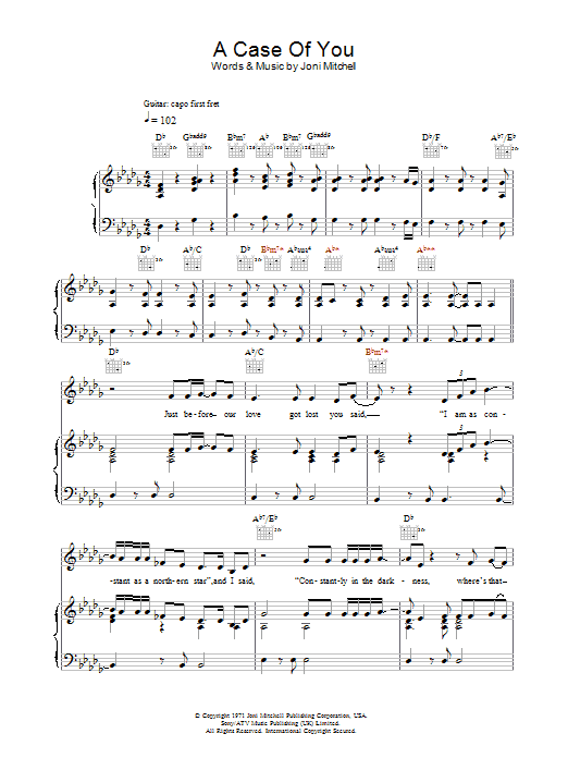 Download or print Joni Mitchell A Case Of You sheet music, chords and digital score arranged for Piano, Vocal & Guitar Chords (Right-Hand Melody). This Pop score includes 6 page(s).