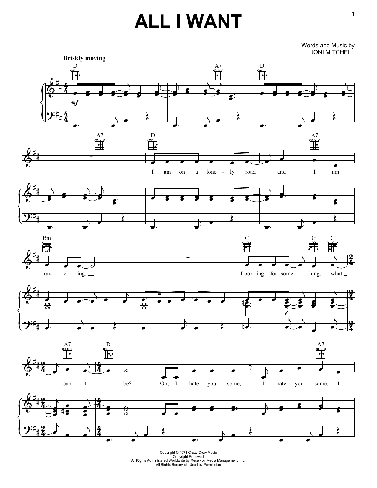 Download or print Joni Mitchell All I Want sheet music, chords and digital score arranged for Piano, Vocal & Guitar Chords (Right-Hand Melody). This Pop score includes 8 page(s).